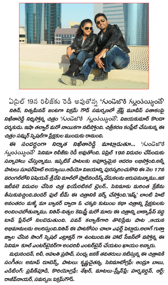 gunde jaari gallanthayyinde on april 19, gunde jaari gallanthayyinde sudio success, gunde jaari gallanthayyinde pressmeet, gunde jaari gallanthayyinde releasing on april 19, nithin, nithya menen in gunde jaari gallanthayyinde