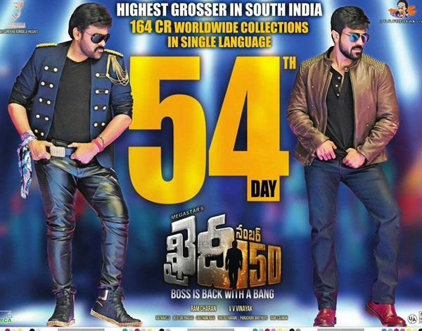సంక్రాంతి కానుకగా విడుదలైన చిరు 150వ చిత్రం, దాదాపు దశాబ్దం తర్వాత మెగాస్టార్ నటిస్తున్న చిత్రమైన 'ఖైదీ నెంబర్ 150'పై ముందునుంచి కొన్ని అనుమానాలున్నాయి. రాజకీయంగా రాణించలేకపోయిన చిరు మరలా హీరోగా వెండితెరపై అదే మ్యాజిక్ను రిపీట్ చేయగలడా? అనే అనుమానం పలువురిని వేధించింది. కానీ ఈ చిత్రం విడుదలై సంచలన కలెక్షన్లను రాబట్టుకుంది. దీంతో ఈ చిత్రానికి 100కోట్లకు పైగా వచ్చాయని అల్లుఅరవింద్, వినాయక్లు ప్రకటించారు. కానీ ఈ చిత్రం కలెక్షన్లపై నిర్మాత చరణ్ స్పందించపోవడం, కొన్ని పత్రికల్లో ఈ చిత్రానికి అంత కలెక్షన్లు రాలేదని ప్రచారం జరగడంతో ఎందరిలోనో అనుమానాలు మొదలయ్యాయి. ఇటీవలే బాలయ్య 'గౌతమీపుత్ర శాతకర్ణి' చిత్రం కూడా 77కోట్లకు పైగా వసూలు చేసిందని నిర్మాతలు అఫీషియల్గా ప్రకటించారు. దాంతో 'ఖైదీ' చిత్రం విషయంలో ఇంకా సందిగ్దత నెలకొంది. తాజాగా ఈ చిత్రం కలెక్షన్ల మొత్తాన్ని ప్రకటనతో బహిర్గతం చేసి, అందరి అనుమానాలకు తెరదించారు. ఈ చిత్రం 54రోజుల్లో 164 కోట్ల గ్రాస్ని వసూలు చేసిందని తెలిపారు. ఇవి కేవలం థియేటర్ కలెక్షన్ల వివరాలు మాత్రమే. అంటే థియేటికల్గానే ఈ చిత్రం అంత మొత్తం వసూలు చేసిందన్న మాట. ఇక శాటిలైట్లు, డిజిటల్రైట్స్.. తదితరాలన్ని అదనం. ఇక ఒకే భాషల్లో ఓ సౌత్ ఇండియన్ సినిమా సాధించిన అత్యధిక కలెక్షన్లు ఇవేనని కూడా క్లారిటీ ఇచ్చారు. అదే లెక్కన తీసుకుంటే ఈ చిత్రం 104కోట్లకు పైగా షేర్ను వసూలు చేసిందని ట్రేడ్వర్గాలు అంటున్నాయి. ఇక 'నాన్ బాహుబలి' అనే కాకుండా రెండు మూడు భాషల్లో విడుదలయ్యే రజనీ, కమల్ వంటి వారి కలెక్షన్ల విషయంలో కన్ఫ్యూజన్కు తెరతీయకుండా, మొత్తానికి కాస్త ఆలస్యమైనా కూడా కలెక్షన్లు ప్రకటించడం ఆనందించదగిన అంశం. కానీ ఈ చిత్రానికి కలెక్షన్లను 50రోజులకు కాకుండా 54వ రోజు ప్రకటించడానికి కూడా అదే కారణమని అంటున్నారు. మొత్తానికి దటీజ్..మెగాస్టార్ అని మరోసారి చిరు ప్రూవ్ చేశాడు.