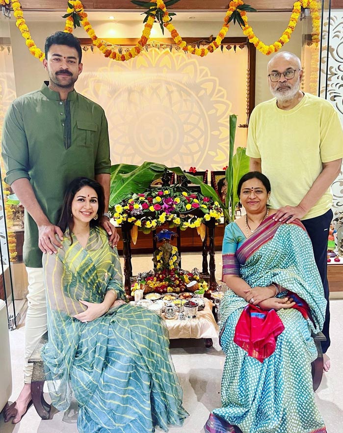 లావణ్య త్రిపాఠి కాబోయే అత్తగారు పద్మజ తో కలిసి స్పెషల్ గా వినాయకుడికి పూజలు నిర్వహించింది. ట్రెడిషనల్ గా సారీ లో స్పెషల్ గా కనిపించిన లావణ్య పూజలు తర్వాత అత్తమామలతో కాబోయే వాడితో కలిసి ఫొటోలకి ఫోజులిచ్చింది. వరుణ్ తేజ్-లావణ్య, నాగబాబు ఆయన భార్య కలిసి ఉన్న పిక్స్ సోషల్ మీడియాలో చూసిన వారంతా ఇంకా పెళ్లి కాకుండానే అత్తారింట్లో పూజలేమిటి లావణ్యా అంటూ సరదాగా కామెంట్ చేస్తున్నారు.