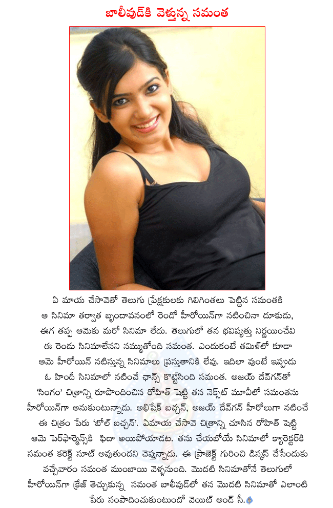 heorine samantha, samantha ruth prabhu, ye maya chesave heroine samantha, samantha got chance in bollywood, samanth flying to mumbai, samantha in hindi movie bol bachchan, samantha pairing with abhishek bachchan in bol bachchan