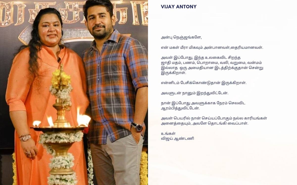 "On September 19, my wife Fatima and I awoke to the devastating news of our beloved daughter Meera's untimely passing at the tender age of 16. Our world was shattered." In an emotionally charged post shared on X (formerly known as Twitter), Vijay Antony poured out his emotions, garnering an outpouring of condolences and support from well-wishers: