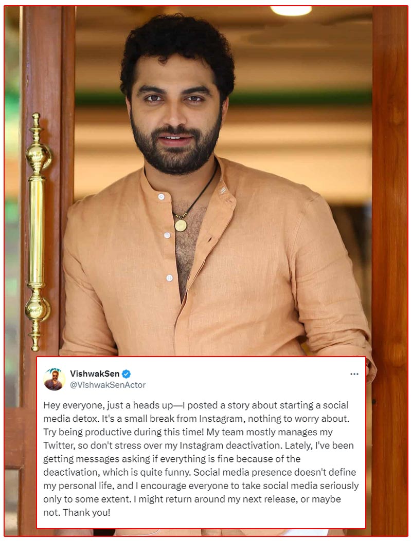 Meanwhile, Vishwak Sen announced a break from social media. He has deactivated his Instagram which lead to many speculations. But, Vishwak cleared air about his absence from social media. He has posted a message and explained why he is taking social media detox in X.