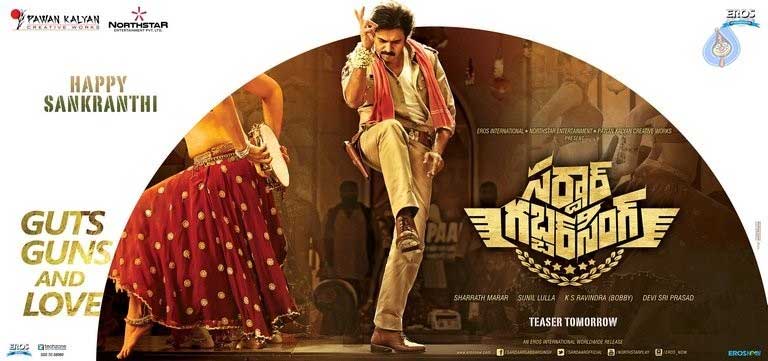 With just one day left for the release of the teaser, the makers of 'Sardaar Gabbar Singh' have released Sankranthi greetings poster to cheer mega fans across the globe. Power Star Pawan Kalyan's mass dancing pose once again betokens what a kind of mesmerizing hero he is! Given this pose, some of the observers foresee the biggest blockbuster result of the film.